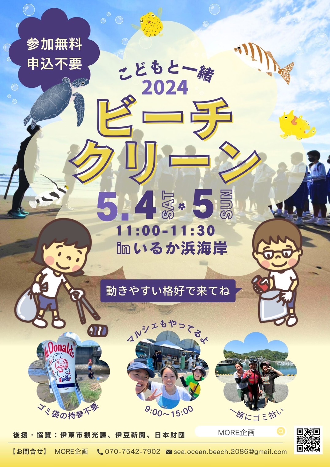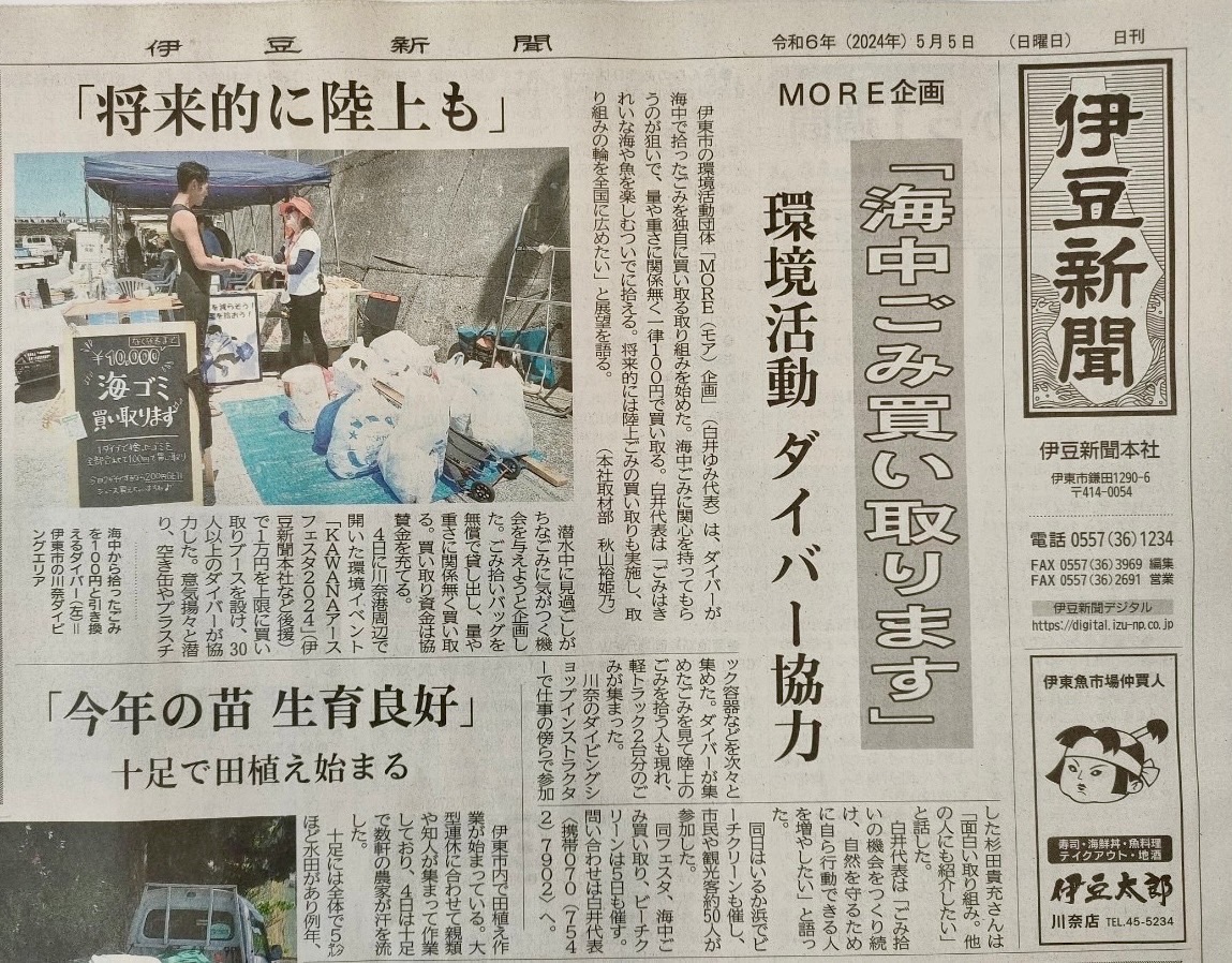【環境に配慮した商品やサービス等の紹介と販売】 ・MORE 企画の環境活動紹介ブース ・アップサイクル品や環境に配慮した店(アクセサリー、エコたわし、みつろうラップ等) ・海のイラスト店(一部の売上を寄付しているイラストレーター) ・コーヒーショップ(フェアトレードやオーガニックの豆使用、プラ蓋無しのカップで提供) ・オーガニックや発酵食品、無添加を中心とした飲食店(紙のテイクアウト容器使用) ・PADI ブース(環境に配慮した商品の紹介や活動の紹介) 等 【海岸・海中・街中清掃】 ・ゴミ袋とトングを各所に用意し、ダイビング前後に海岸清掃をできるようにする(イルカ浜、エント リー口、港の周辺等、人数と移動方法で場所は検討) ・清掃後のゴミをまとめておく場所を作り、2 日間で拾えたゴミの量を計測する ・ゴミ拾いを啓発するブースを作り、水中清掃の大切さをダイバーに伝える ・海上保安庁も参加をして、ビーチクリーンを実施する <概要> 【日時】2024 年 5 月 4 日(土)・5 月 5 日(日)9 時 00 分~15 時 00 分 【場所】川奈ダイビングエリア(駐車場~エントリー口間の壁沿い) 【企画・運営】MORE 企画、いとう漁協 川奈支所 川奈ダイビングサービス <詳細> 【集客方法】 ・ダイビングサービスでのポスターSNS、ショップへの周知 ・ダイビングショップや関係者(出店者含む)の SNS 周知 ・観光協会や環境課、地元の活動団体と協力し各所で周知 ・メディア事前掲載(伊豆新聞、ダイビング WEB マガジン) 【後援・協力】 伊東市観光課、伊豆新聞、伊東なぎさステーション、海上保安庁(伊東マリンパトロールステーション) <参加団体> 主催:MORE企画(運営事務局) 会場:伊東漁協川奈支所、川奈ダイビングサービス(企画、場所提供) 協賛:伊豆新聞、伊東市観光課、海上保安庁(MPS 伊東) <出店者> nao’s illustration:お魚イラストのグッズ販売(売り上げを環境活動団体へ寄付) halehapakailii:海のレジンアート(アップサイクル商品) MIHANADA:水中ゴミ拾いポーチ(環境のことを考えた水中ゴミ拾いバッグ) HOSSY:アルミ製の魚の洗濯ばさみ(脱プラスチックの洗濯ばさみがテーマ) まるまるどっぐす:オーガニック、天城産伊豆鹿肉ジャーキー、河津川産天然鮎ジャーキー 彩✴︎sai アート店:ワンポイントフィンアート happy planet:エシカル雑貨をハンドメイド、エコたわしやアップサイクルの販売 TSUGU:海で見つけたカケラをアップサイクル、収益の一部を海洋汚染問題に取組む団体に寄付 たけみごはん:野菜たっぷりの彩り弁当(化学調味料・白砂糖不使用、天然の塩使用) ハナのつむじ:伊豆の無農薬野菜お弁当、無農薬ジュース、自家焙煎珈琲、身体に優しいおやつ 珈ノ鳥珈琲:バタフライカップを使用したノープラスチックコーヒー店 くろいあひる:天然酵母ドーナツを無添加で販売、その場で揚げて提供 ふりだやカレー:食材にこだわったエスニックカレー、ノープラスチック おむすび café:地産地消の身体に優しいおむすび、ノープラスチック Rainbow of grace:エコ・安心・安全を心がけた美味しいカンパーニュホットサンド DJ:masa&tomo&イムハQによる DJ ブース <実施実績> ・来場者(一般):4日200名、5日100名、合計300名 ・来場者(ダイバー):4日104名、5日77名、合計181名 ・ビーチクリーン:4日50名、5日15名、合計65名 ・2日間で回収したゴミの量(陸・水中)300キロ |