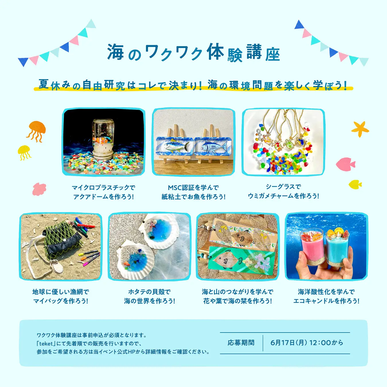 (1)時期: a.2024年7月(計2日間) b.2024年8月(計2日間) (2)場所: a.ウィズ原宿(東京都渋谷区) b.コワーキングスペース TOGITOGI(岡山県岡山市) (3)参加者: a.5,000名(園児、児童と保護者) b.500名(園児、児童と保護者) (4)内容: a.海の環境問題・生態系をテーマにしたワークショップ b.海ごみを使った周知に繋がる参加型創作ワークショップ c.砂浜でのマイクロプラスチックの収集体験と展示、アップサイクル体験コーナー d.トークショー(WoWキツネザル、さかなのおにいさん かわちゃん) e.環境問題に取り組む企業を紹介するブース展示 f.海を表現したフォトブース g.イベントで学んだ事を書き込めるシートの配布 |