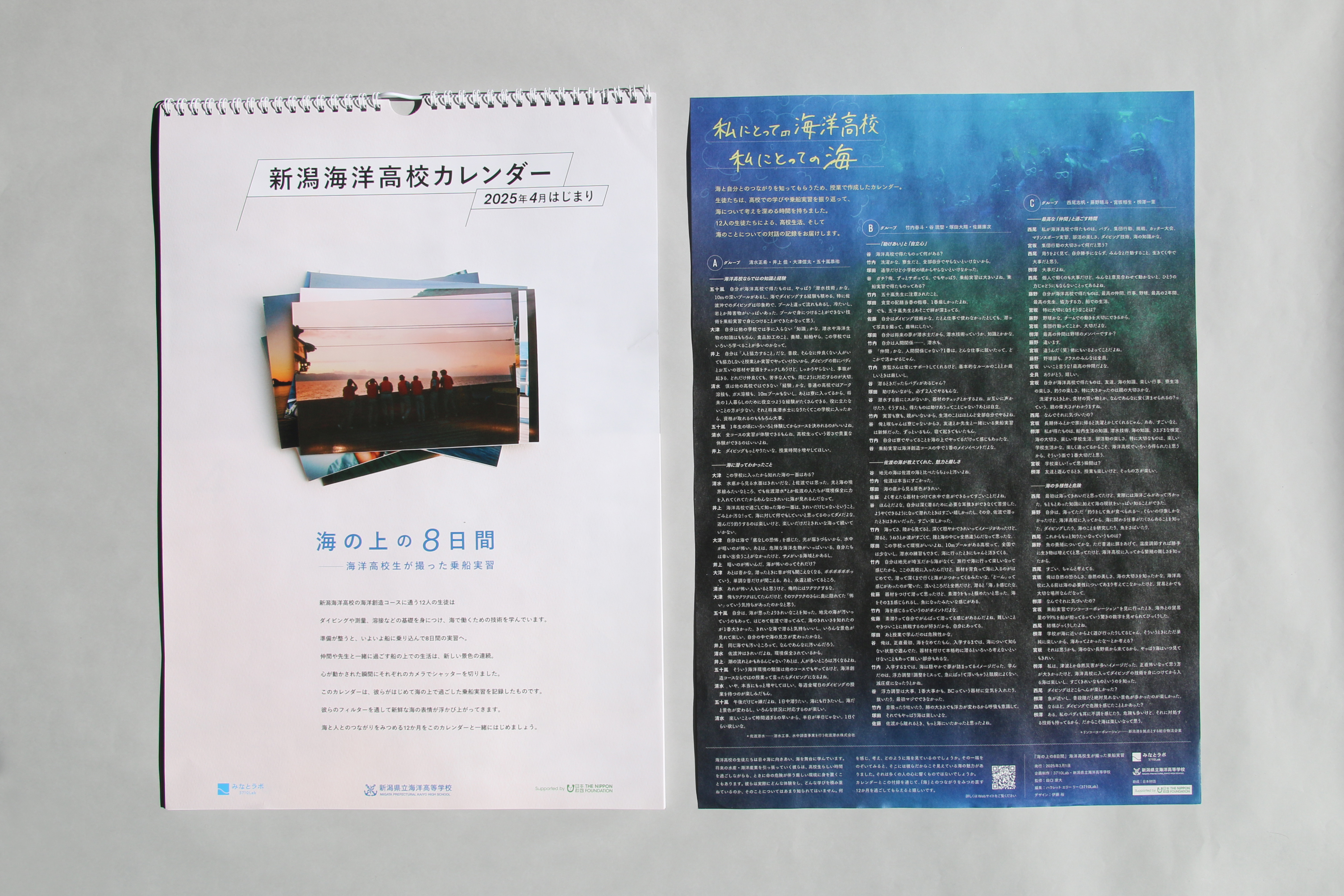 新潟県立海洋高等学校との協働による制作したカレンダーと付録。新潟海洋高校の生徒たちが海と向き合って活動するなかで、どのように海を捉え、海を感じているのかを探究し、社会に向けて発信することを目的に制作。カレンダーは、学校と同じく4月からスタート。毎月、乗船実習で生徒たちが撮影した海の写真が掲載されている。そこには、彼らの心が動かされた瞬間が映し出されている。さらに、海洋高校ならではの行事も紹介。海と向き合い、学びを深めていく彼らの学校生活に想いを馳せてもらうことをねらいとし、カレンダーとして制作した。