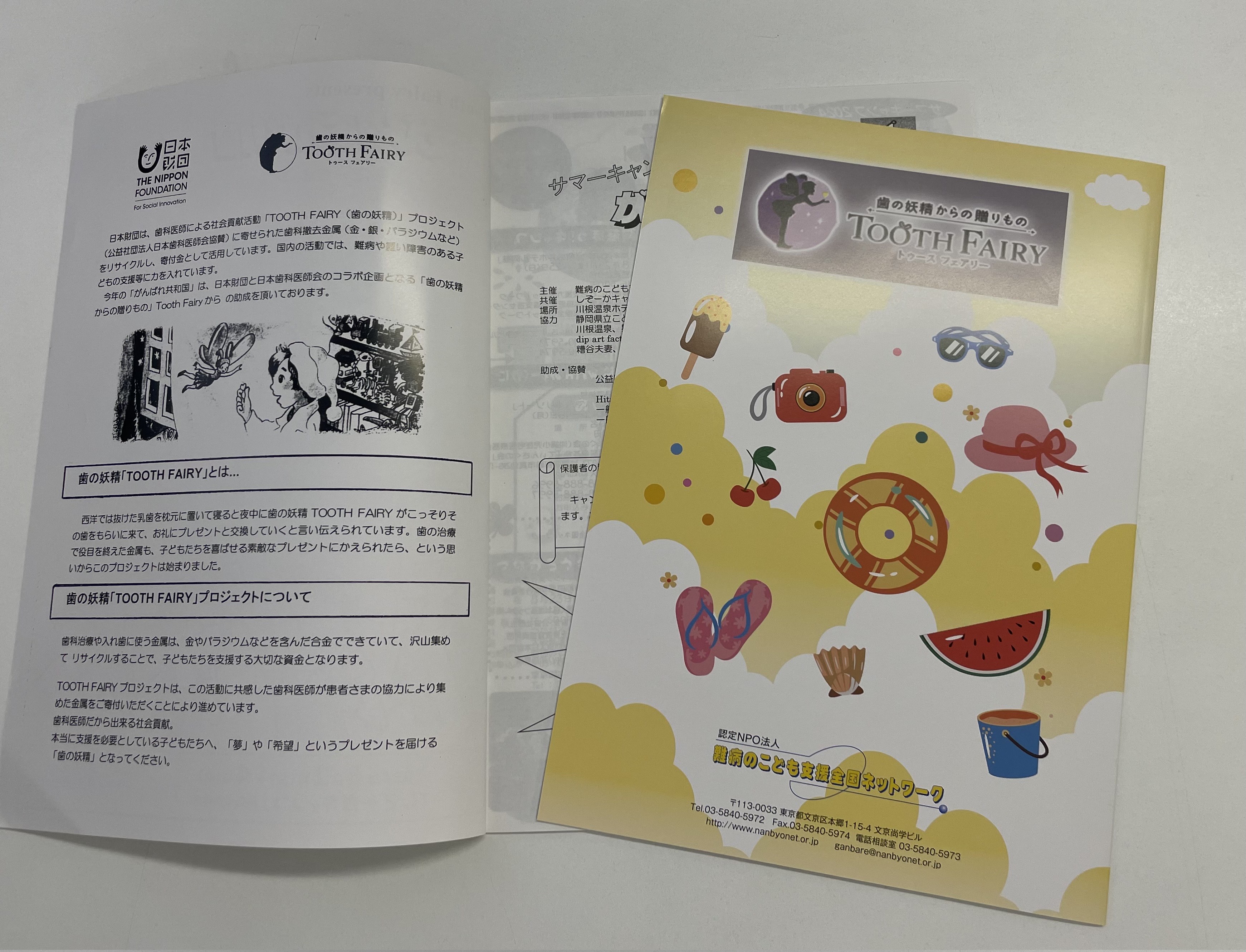 目次(の一例) 表紙 日本財団・日本歯科医師会「Tooth Fairy」からの助成であることを示すページ 開催の要項 サマーキャンプ“がんばれ共和国”について ホテル館内図 キャンプのスケジュール 参加者へのご案内と注意事項 備忘録 旅行保険の案内 お友だちをつくろう(連絡先記載欄) 難病のこども支援全国ネットワークの活動案内と会員制度について ホテルへの案内地図 裏表紙(「Tooth Fairy」のロゴ) |