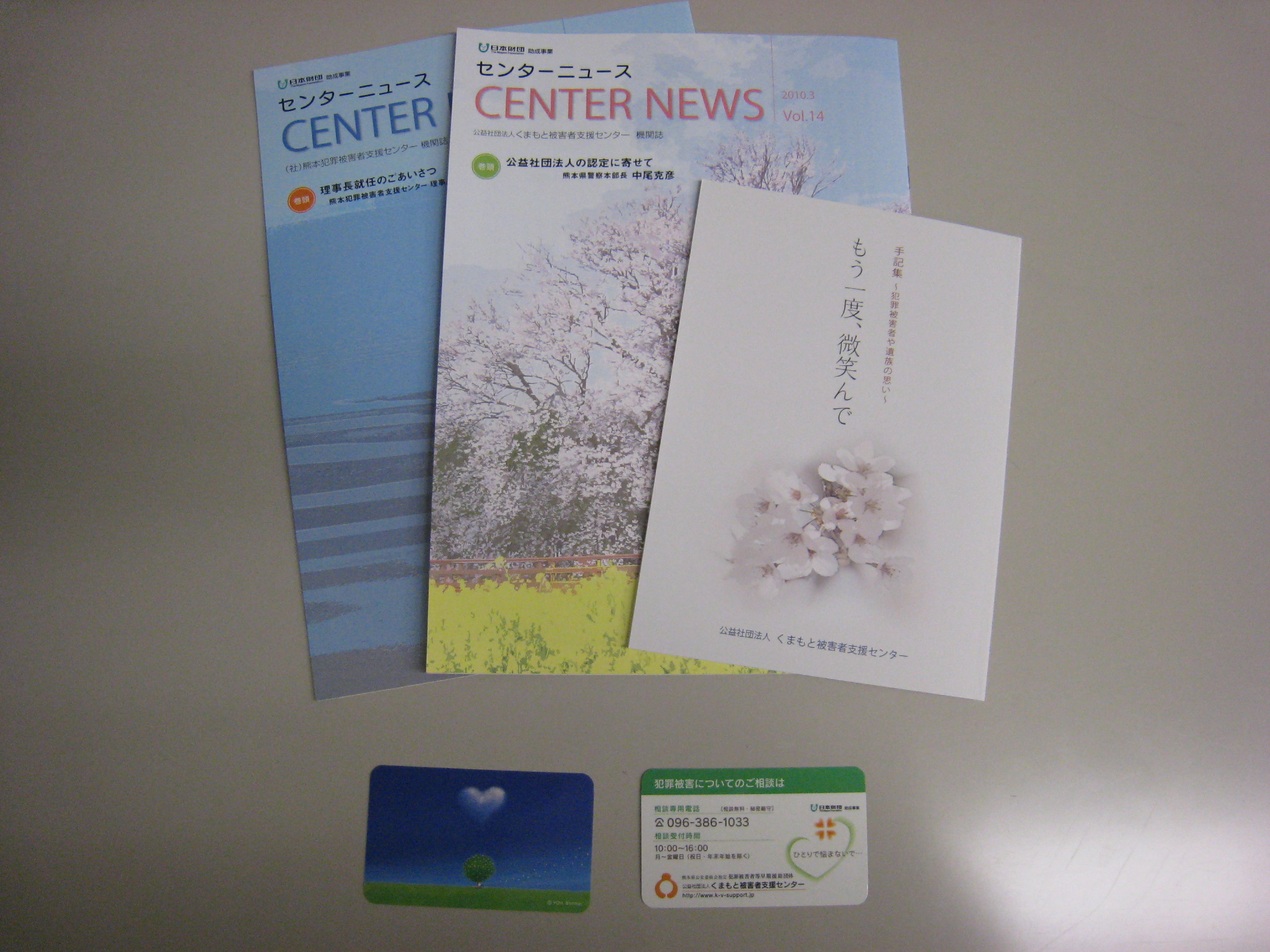 犯罪被害者等がおかれた現状や社会全体への被害者支援意識の高揚をはかるため、 機関誌「センターニュースを年2回発行して、賛助会員や関係機関に配付した。 2009年9月:5,000部発行 2010年3月:5.000部発行 2 被害者、その家族・遺族の手記作成 自助グループ「さくらの会」メンバーの手記と当センターで支援を行った被害者及びその家 族の手記を掲載した手記集『もう一度、微笑んで』を発行して、自助グループや団体会員、 関係機関に送付した。 2010年3月:1,000部発行 3 犯罪被害者支援ボランティア養成講座に係るチラシの作成 犯罪被害者支援に関心があり、広報・啓発活動や電話相談・付添等の直接的支援活動 を目指す支援活動員を養成するために、「ボランティア養成講座」(全10回講座)を行って いる。その受講生を募るために、受講生募集のチラシを作成し公募した。 2009年5月:1,500枚作成 4 名刺サイズ広報用カードの作成 2009年11月に「公益社団法人」の認定を受けたことを機に「熊本犯罪被害者支援セン ター」から「くまもと被害者支援センター」に名称を変更した。そのことにより、名称変更に伴 う周知のために名刺サイズの広報用カードを作成し、広く県内に配布した。 2010年2月:4,000枚作成 |