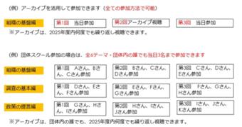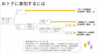 6つのテーマの内、2つ以上関心がある方は「年間スクール参加:22,000円(税込)/人」がお得です。同組織で3人以上で参加したいという場合は、「団体スクール参加:66,000円(税込)/団体」を選択ください、第1回はAさんBさんCさん、第2回はDさんEさんFさん‥・など参加者を回ごとに入れ替えて多くのスタッフに効果的に研修へご参加いただけます。