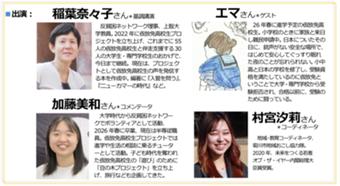 グループ対話セッションや、ゲストとの対話も行う予定です。見聴きだけの参加も可能ですが、この対話の場を一緒につくれるよう、お声を出していただけましたら幸いです。ご登壇者以外の参加者さまのお顔は写らないよう初めはこちらで設定いたしますが、ご発言の際は自主的にお顔を写していただけます。