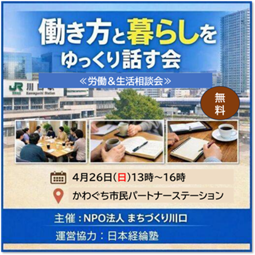 【参加者募集】無料・働き方と暮らしをゆっくり話す会(労働・生活の相談会)開催(4/26日)川口駅前・かわぐち市民パートナーステーション